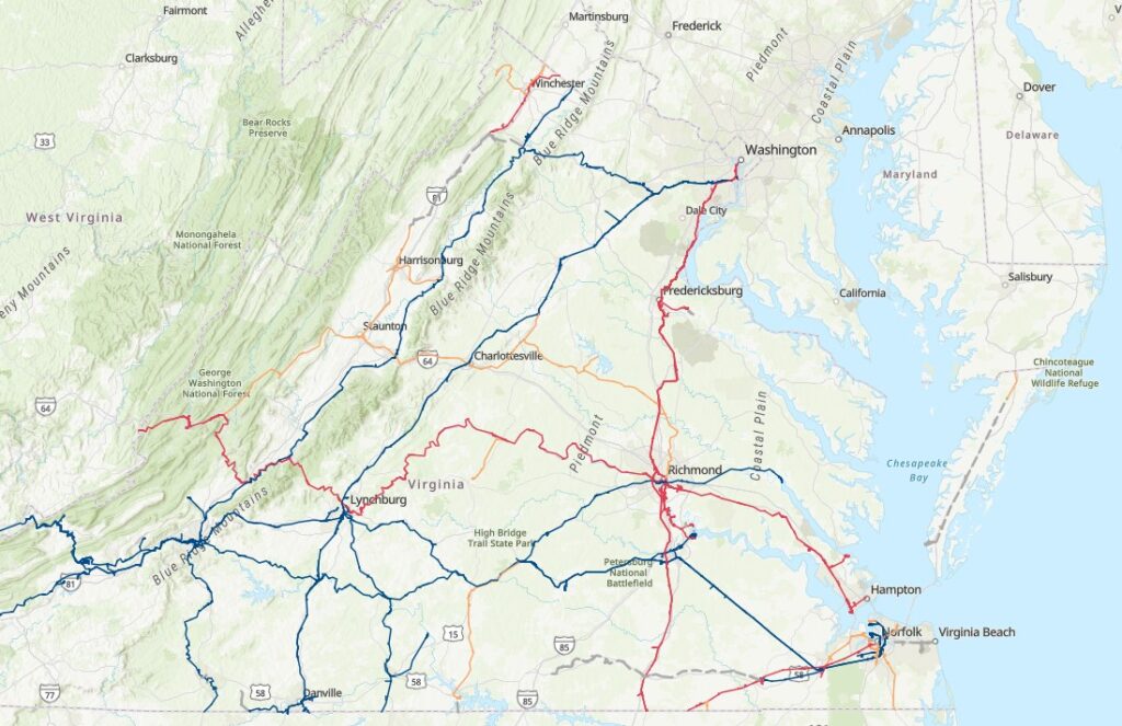 Interactive na application na nagpapakita ng mga layer ng imprastraktura ng tren para sa Virginia.